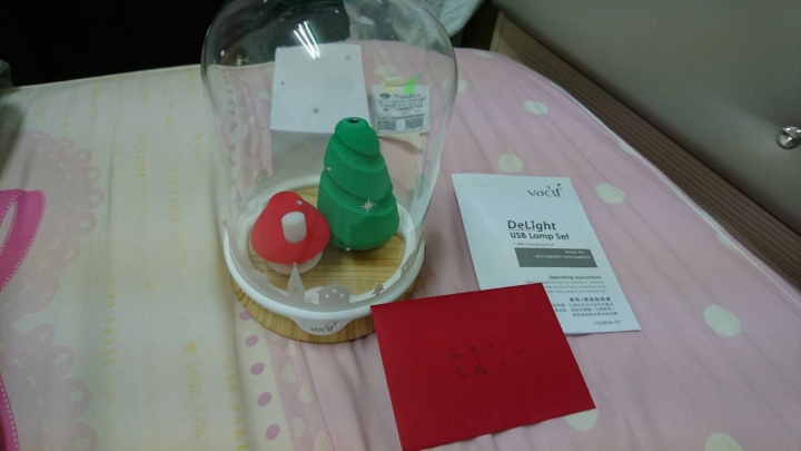 平常都要睡到10點才會起床上班的我~ 彷彿聞到了聖誕禮物的氣息~ 今天8點就起床了呢剛好9點一到宅配大哥就打電話告知我收禮物拉!!! 登愣!!!帶著興奮的心情~ 使用了狂暴八神的MAX超殺 禁千貳百拾壹式 八薙女拆開了外包裝好有心! 裡面還有一張卡片~卡片的內容! 玲小姐! 謝謝妳~ 也祝妳聖誕快樂!內容物:組裝完成! 看了說明書好一陣子 原來這檯燈後面還有孔可以讓我們充電呢!! 超酷!關燈後! 我的拍照技術差~ 反反覆覆拍了好幾張 拍不出肉眼看到的唯美感! 是很漂亮的燈 不像照片那麼醜><記得前幾個月我老婆才在說要買個檯燈! 因為用小夜燈的話5個月大的女兒 怕她會太亮~就那麼剛好抽到我需要的東西! 還可以調燈光亮度! 還那麼漂亮! 真是太謝謝妳了!第一次參加交換禮物! 真的是讓人很開心呢! 尤其是出了社會娶了老婆生了孩子後~ 幾乎不會有這種活動了!讓人感覺有滿滿的..................大驚喜!!!