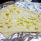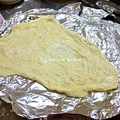 5.把麵團輕輕拉成薄片狀,鋪在錫箔紙上,以最大火烤約3~5分鐘,取出再表面抹上奶油即可。