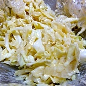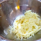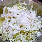 3.將高麗菜與洋蔥混合,加入鹽、麵粉、胡椒粉、水、蛋拌勻呈黏稠狀。
