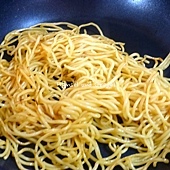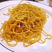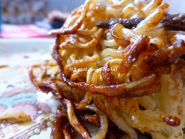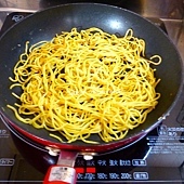 4.將鍋中放點香油,將黃麵用中小火煎至香脆,取出備用。(有點像意麵的樣子)