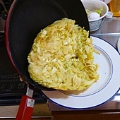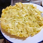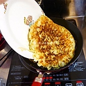 4.將剛剛的高麗菜洋蔥絲平鋪在鍋中用小火慢煎至焦脆,取一個盤子斜斜地將它滑出。