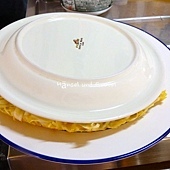 5.將黃麵鋪在最底層,再將剛剛的餅皮覆蓋在上面,