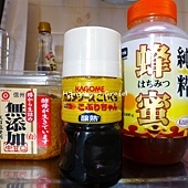 6.將味增、蔬菜醬汁or大阪燒醬和蜂蜜攪拌均勻後,平均抹在大阪燒的最上層。