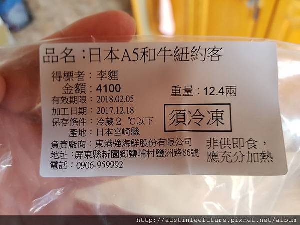 首先說明,我是在晚間(半夜一點左右)標到,這塊是12.4兩的宮崎A5等級和牛紐約客,在拍賣時是原塊拆封的肉現切下來給大家標,依照東港強這裡的規則是買3000元以下的話需負擔運費250元,滿3000元的話自行負擔運費100元,滿5000元的話可以免運費,滿一萬元或是兩萬元有送東西,我是還沒有那麼瘋啦,畢竟是第一次跟人家瘋FB直播拍賣,所以只想小買一塊試試
