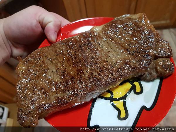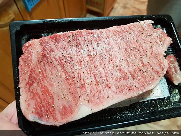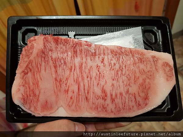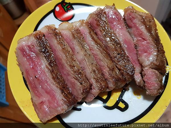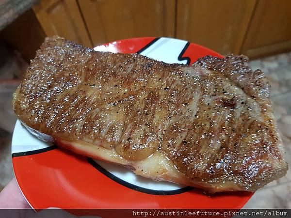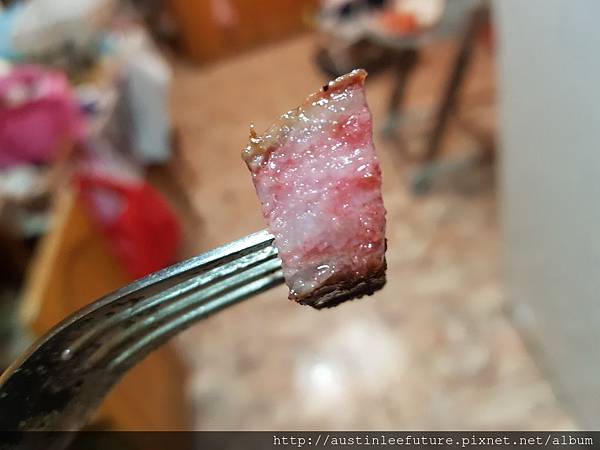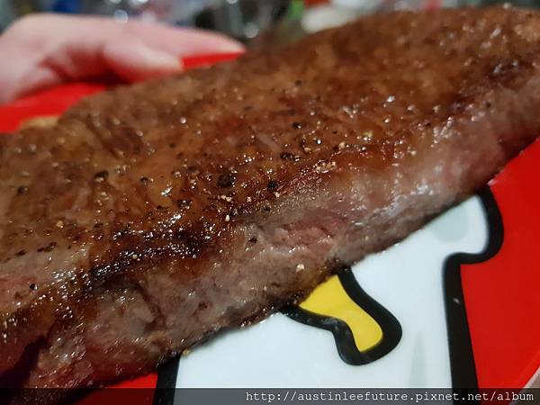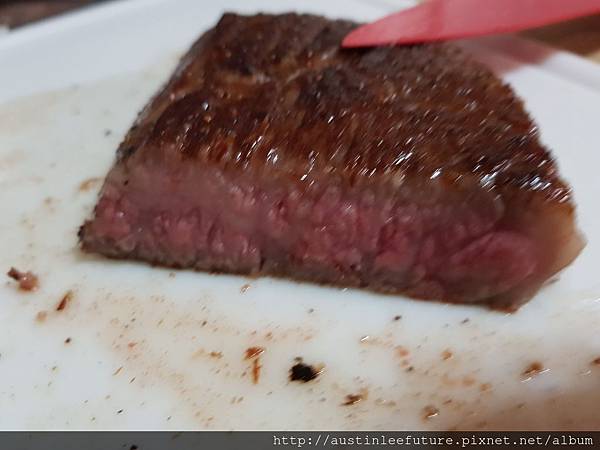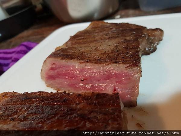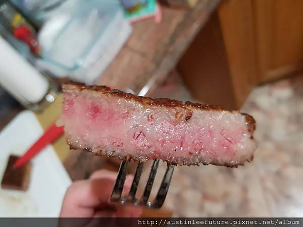 我們,還是適合吃肉比較多的,而不是油的比例超過50~60%的,後來上網看了看,其實人家也不推薦當牛排整塊吃,一般建議鐵板燒小小塊吃巧,或是用壽喜燒薄切的方式吃軟嫩的口感,像這樣整塊牛排這麼油,除非是很愛油香味,不然很難真的整塊牛排這樣吃