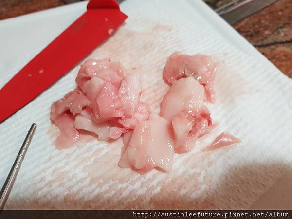 因為我也不喜歡太油,所以把前端那塊油也修掉了,油包著的兩小塊肉取了下來,可不能浪費啊
