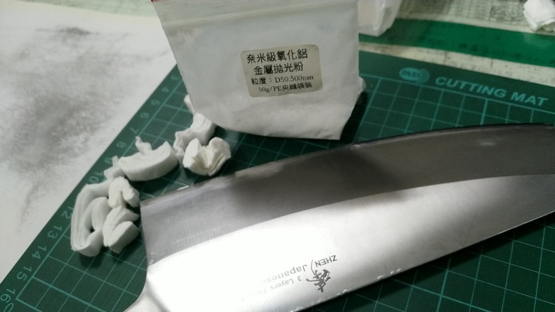 最近也迷上了磨刀,雖然家裡不太煮飯,每周用刀也沒個一兩次,但是把刀磨到走火入魔真是挺有趣的。先前不太注重刀具之類的問題,用了磨刀器發現刀子還是崩刃缺口,磨刀器拉了很久也沒差多少,還越來越慘。後來懵懵懂懂買了一個雙面砥石 400-1000 ,磨起來就有模有樣了,不過也沒在意整平這件事,但做菜一定是夠利的。然後開始磨刀後,就一定會看到大家秀菜刀切各種東西......於是也另外找一些東西來磨刀。磨了一段時間,覺得鑽石板真的好用,有一定的平整度、磨起來又快又有感。加上之前手上就有些拋光磨料...就開始走不尋常路線了。先推這個便宜的鑽石磨片磨了不少刀,也不見衰退,就是過於薄、不止滑的膠墊,尺寸小了點,但是可以找到3000番號的。3000號磨起來,就已經略勝美工刀的利度了,相當不錯。磨刀番號可以跳大一些,不要買太密集。若是刀子沒有修平、整理崩口的需求,我覺得一片3000磨一磨就好。切切餐巾紙捲很滑順,下刀平順感覺很好。之後就開始了幫各各煮飯媽媽磨刀的行程,但是得到的是全面100%的要求[不要磨太利,可以用就好]而且拿到各種奇怪的菜刀,菜市場的百元菜刀,各種剁骨、互敲刀背、崩角、扭曲、祖傳菜刀.....真不是想像中的磨利就好。不過也有一些材質不錯的菜刀,磨到一把青紙鋼,磨好的銳利度的確不錯。這邊我說一下泡水砥石跟鑽石的感想,用過的刀具多半不太平整,頂多就是板一鈑看起來比較平而已。砥石磨起來比較溫潤,非平整的刀面還是可以全面磨到可用,不過一塊也要不少錢,就沒有繼續投資下去,但就做菜這件事,其實一塊雙面砥石就一定夠用(不會想去搞鏡面刀具的話)鑽石砥幾乎表面都是平整的,碰上彎曲的刀具,就只能強力犧牲刀具,彎進去磨不到就是磨不到,只能重新打薄重建次刃,但最後可以做到一個非常好的結果。如果是刀本身狀況條件好,那真是用砥石磨幾下就好用。需要整理的話,比較推用鑽石砥,磨你想要角度。雖然我心中也是想買個高價的菜刀,但是萬一不用常常磨刀的話,又會很無聊,十分的矛盾,磨刀的確是頗有趣療癒的.....最近磨刀開始導入這個磨料 (粒徑500nm 不知番數算多少,削切力好)刀子先扳至大約平,600把刃部通通磨出來 (粗磨整平我覺得最重要),這隻刀背也敲過,整個刀身難救...1200跟3000磨一磨、開鋒。在紙上抹一些磨料,用盪刀的方式來磨。然後戳到手指三個傷口.......這把菜刀材質磨起來銳利度挺好的,橡皮筋只要壓就斷 ,美工刀還需要切然後拉才能切斷橡皮筋。不過這樣拋光磨不太實際,畢竟拿去切菜都會損傷拋光面,純粹是走火入魔~至於銳利度的持久度,對我來說不太重要,現在巴不得天天做菜完,都可以再來磨一下