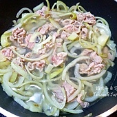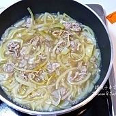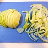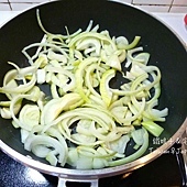 3.洋蔥逆紋切細條狀,熱鍋加橄欖油下去中小火拌炒約2~3分鐘。