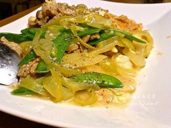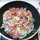 接著再將豬肉片攤開,加入一起抄為拌炒1~2分鐘。