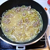 6.將酸奶油麵粉團加入鍋中,均勻攪散開至濃稠狀。