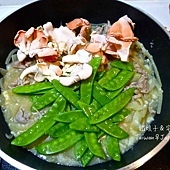 接著加入扁豆跟玫瑰菇均勻稍微拌炒,即可熄火。