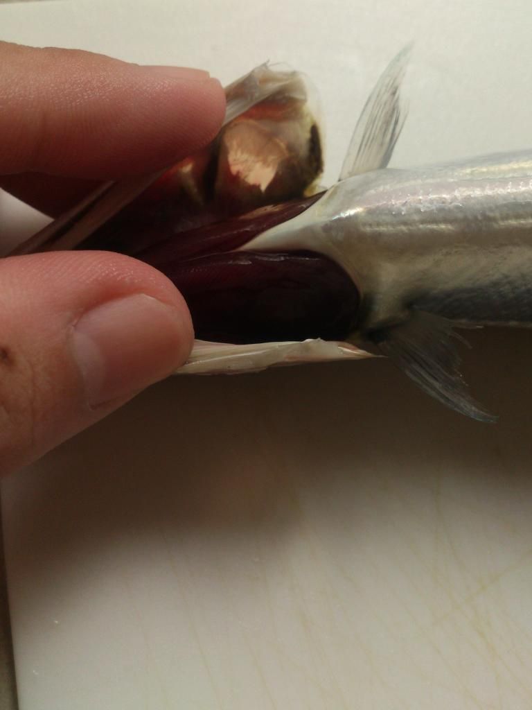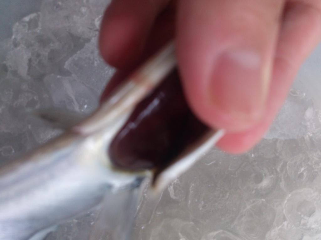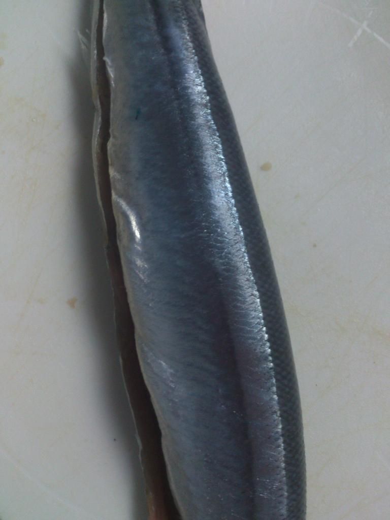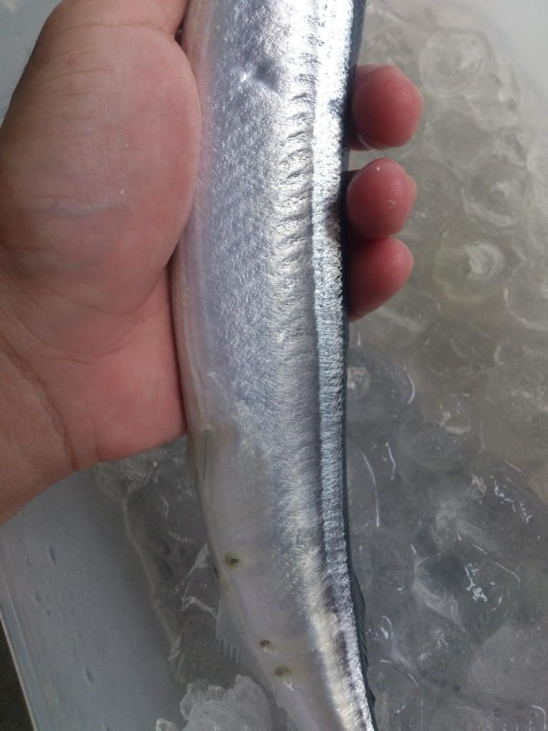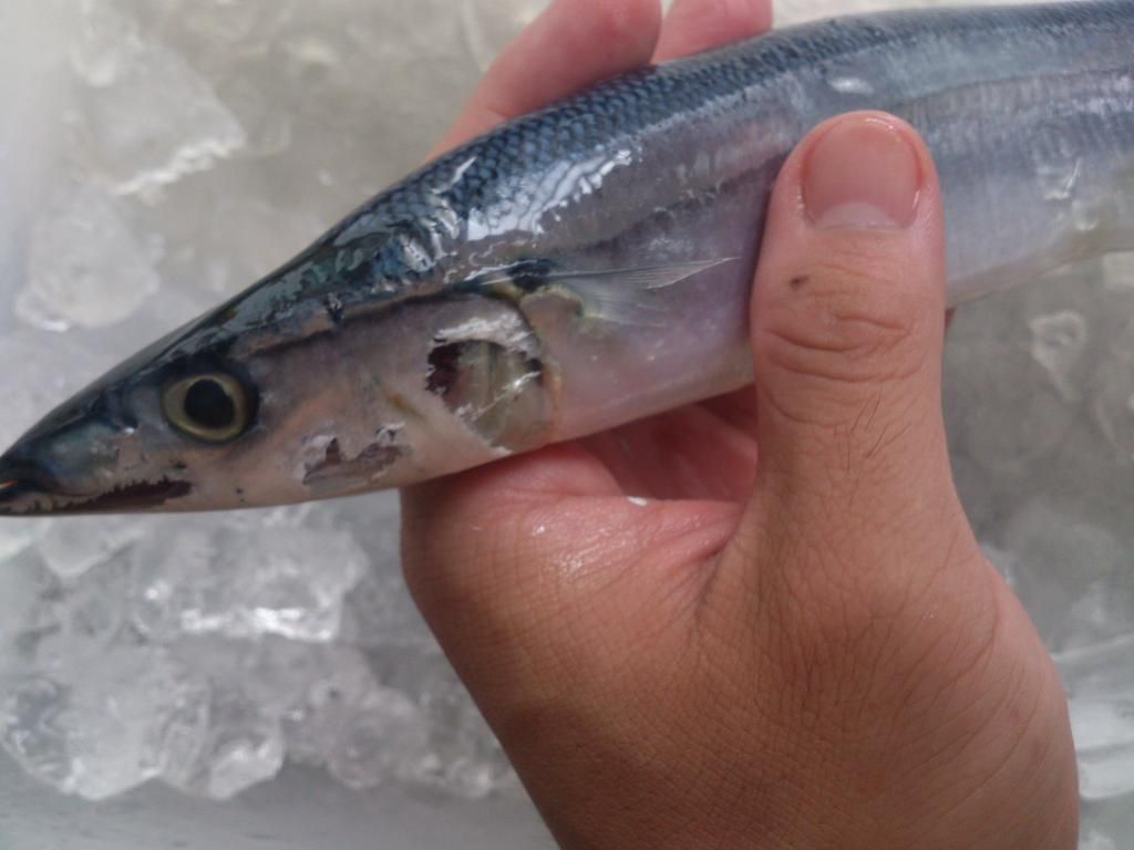台灣市售的秋刀,都是在日本.韓國或是俄羅斯海域補獲,再用搬運船載回來的.原則上品種或大小是跟日本本土販賣的是一樣的,頂多只有等級的差別.圖上這尾秋刀,應該是在1個月前補獲的,因為可以從圖中看到,秋刀魚身上有許多蛀洞,會有蛀洞的原因是因為秋刀身上還有線蟲寄身,線蟲會到處鑽洞,所以魚身上會有洞.接近中秋節補獲的秋刀,魚身上的線蟲就會減少很多,所以魚身就會更漂亮.以上為個人淺見.