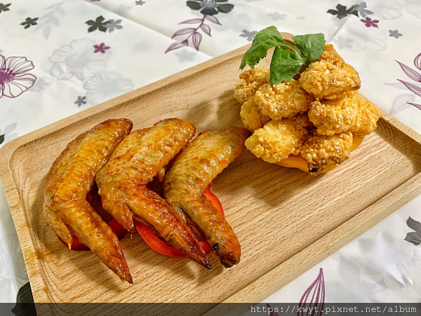 雞米花 & 二節翅也是,放入烤盤中,送入氣炸鍋烤起來!