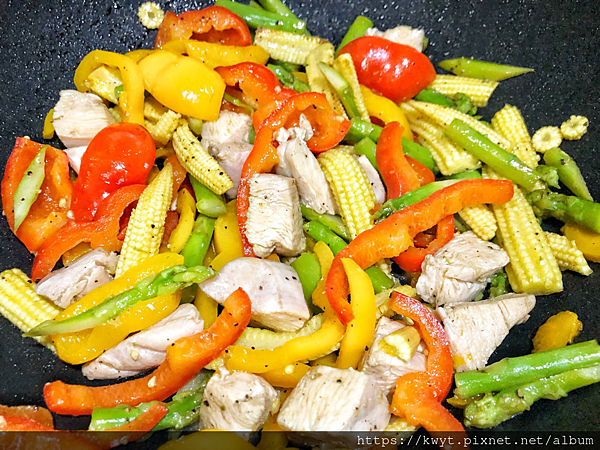 先將蔬食類的食材下鍋炒一波後,最後再加入舒肥嫩雞胸炒約3~5分鐘即可。