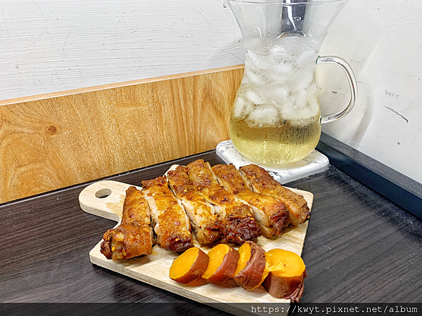 炎炎夏日的午餐,使用氣炸鍋為自己烤一塊熟烤雞腿排,搭配電鍋蒸好的地瓜、果醋飲~