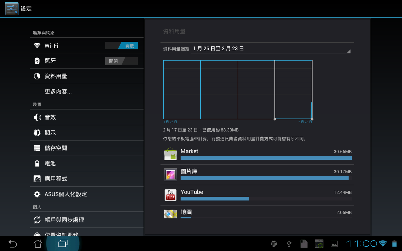 設定中多了很多項目可供選用,上圖的是資料用量, 同樣是跟TF201的一模一樣, 可以查看單日或多日的總流量。
