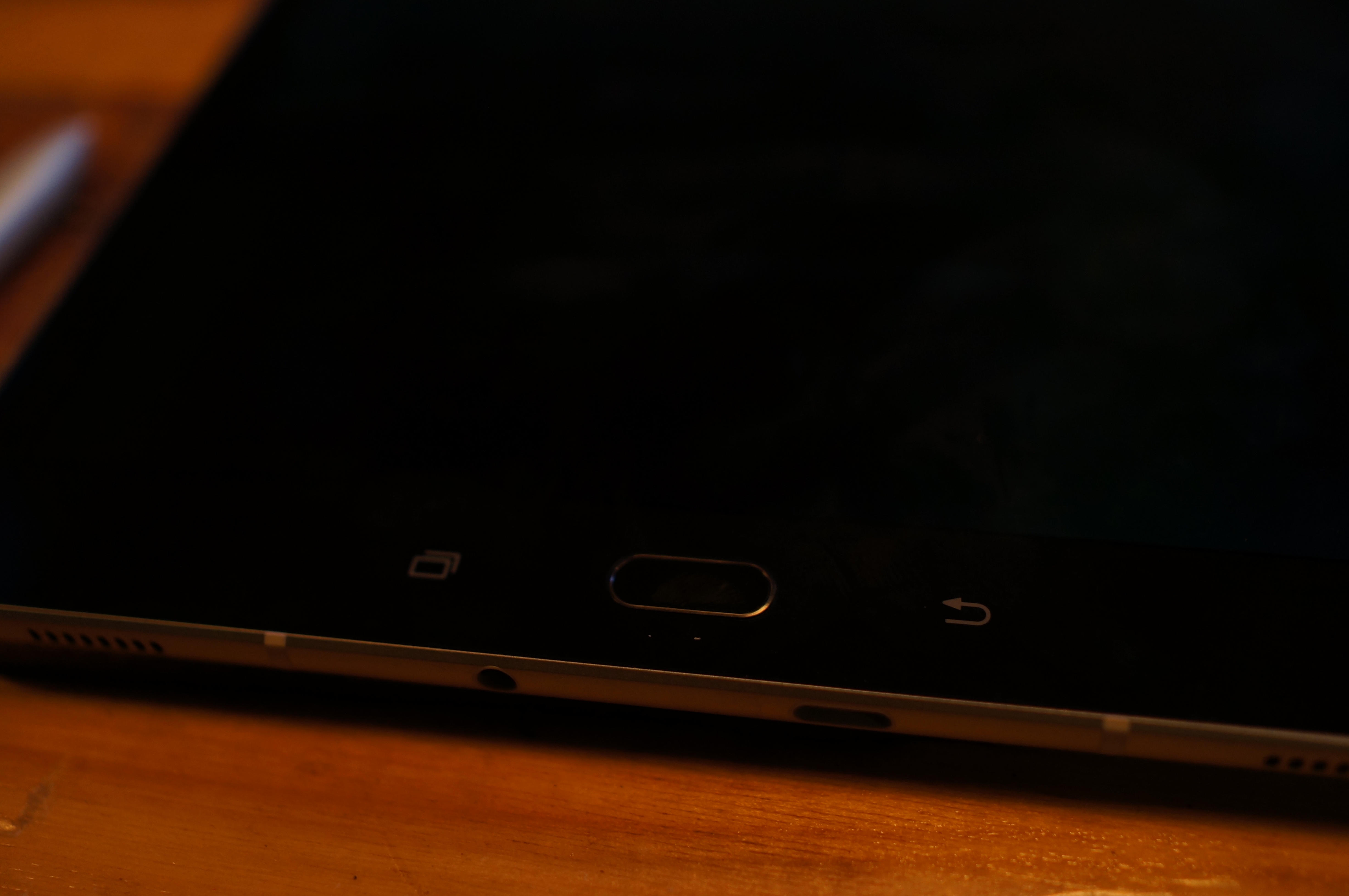 正面下方,也保留實體按鍵。中央的Home鍵還兼具了指紋辨識的功能。左邊為最近使用的應用程式鍵,右邊為返回鍵。