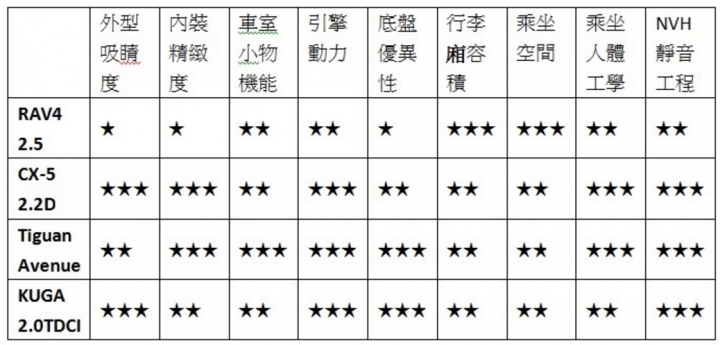 安卓拉貝貝 wrote:tiguan內裝比RAV4...(恕刪) 不會吧!!!當初試rav4.cx-5.forester 一看很明顯,這3台中內裝質感最低就是rav4,如果你說的是rx,當然質感算棒的而下面這位仁兄,評論算是中肯,眼光也是這樣,他給一代tiguan 三顆星 rav4一顆星。 這怪怪的吧,一代內裝應該是差二代不少,還給一代三顆星http://www.mobile01.com/topicdetail.php?f=609&t=4782732PS.借用這仁兄圖表還有這裡也是覺得rav4內裝差,連toyota版也在討論tigauanhttp://www.mobile01.com/topicdetail.php?f=264&t=4916591