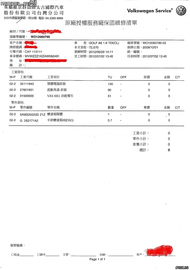 附上維修單, Golf VI 1.6 TDI 保固內變速箱損壞更換另外主旨:關於民眾江君陳情貴公司進口福斯牌Golf VI 1.6 TDI車輛所使用之DSG變速箱應比照美國及中國大陸延長保固期限至10年事宜乙案,轉請妥處逕復,並副知本司,請查照。說明:依據民眾江君101年7月3日電子郵件辦理。正本:香港商標達國際汽車有限公司台灣分公司副本:江XX君、財團法人車輛安全審驗中心交通部敬啟發文文號:路臺監字第1010408631號 發文日期:101/07/05昨天我也打電話到福斯0800, 希望新變速箱的保固能重新計算四年, 後來福斯只是推給保養廠打電話給我, 希望說服我取消要求, 看來福斯還是沒誠意解決, 接下來, 唉, 又能如何呢? 台灣人的權益真的就不如大陸人及美國人嗎? 人家都已經改保固10年了, 保養廠口口聲聲說新變速箱保證沒問題, 我回應說既然沒問題, 福斯為何不敢延長保固呢? 就是還有問題嘛!