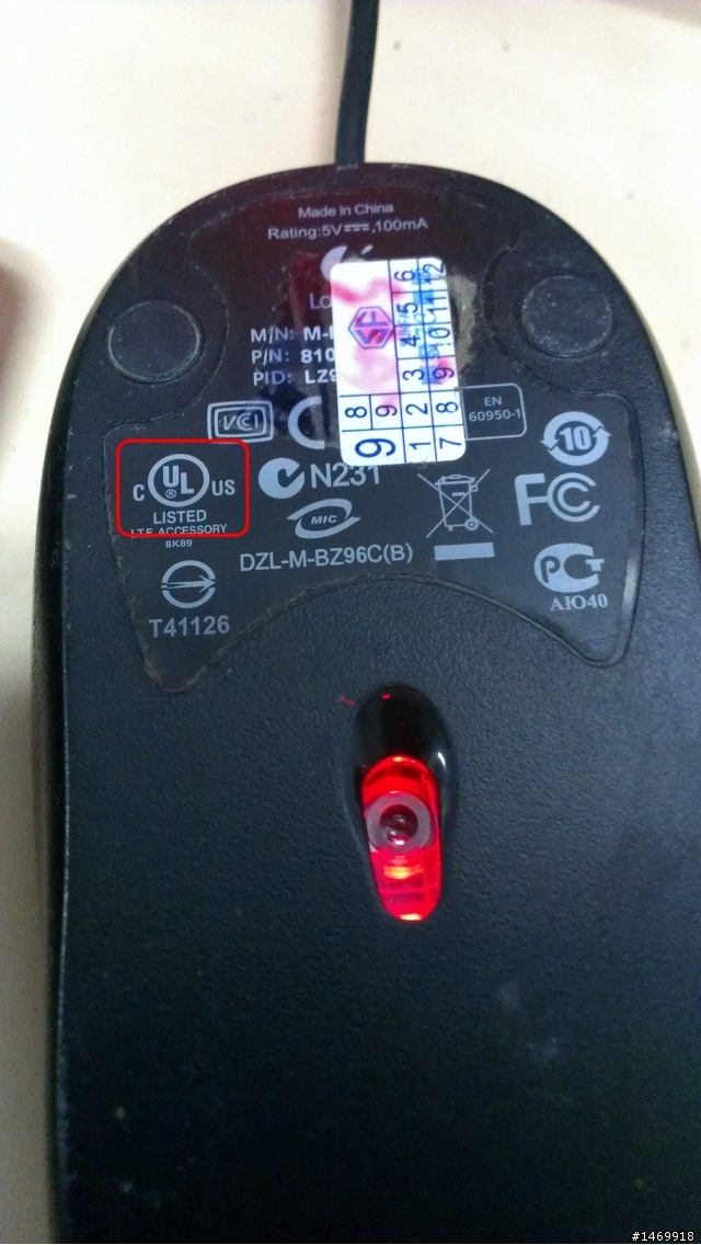 我看到UL安全認證標誌在滑鼠背後標籤的左上方