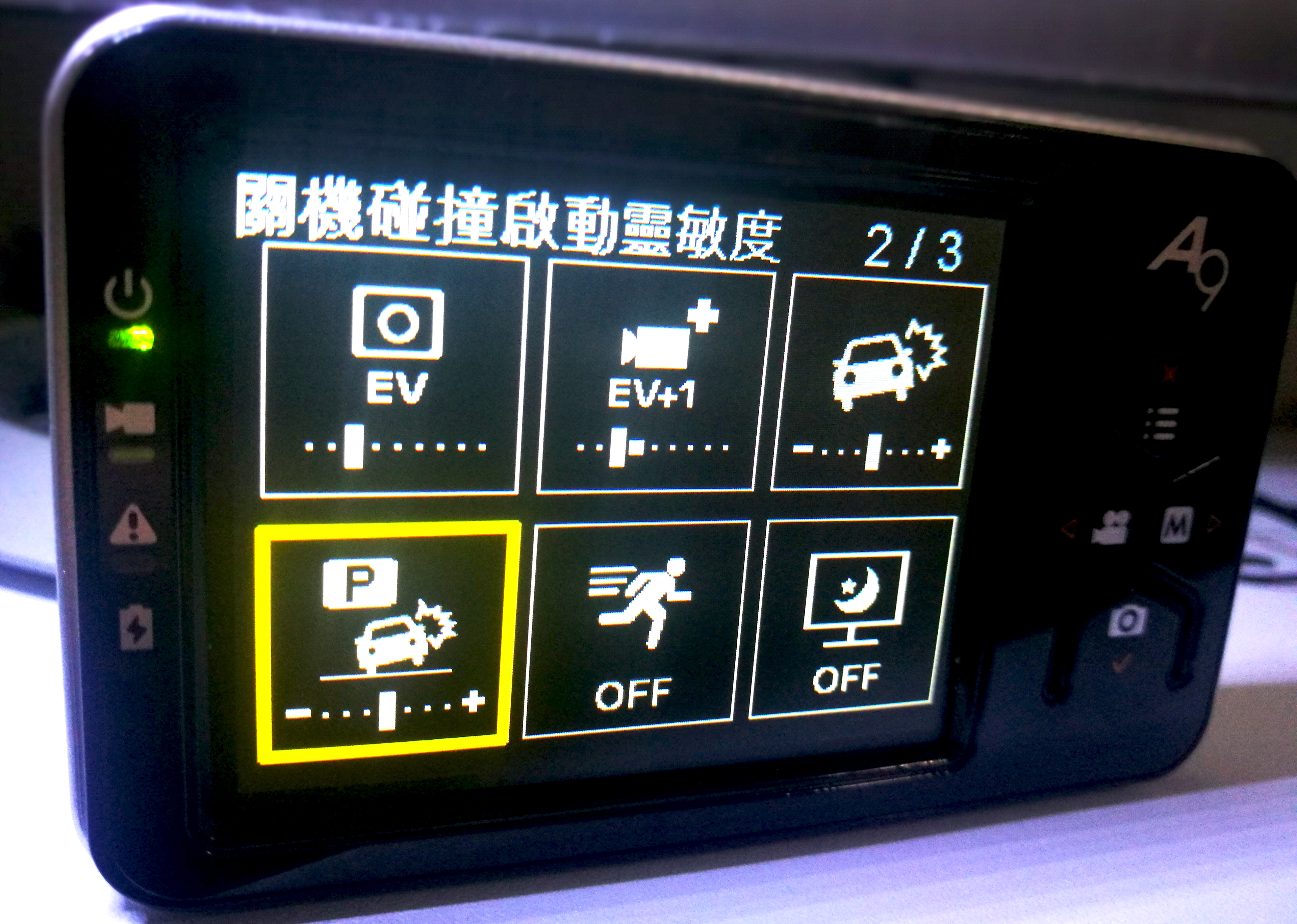 為了確保A9碰撞靈敏能精準到什麼程度,在出廠設定下,個人親自嘗試關機後用手輕輕拍打主機, 隨後A9果然迅速啟動開機錄影鎖檔,十足讓我對它的安全性能上多了份可靠感,若真正發生各種意外事件,我想A9也肯定能當個稱職的行車守護神