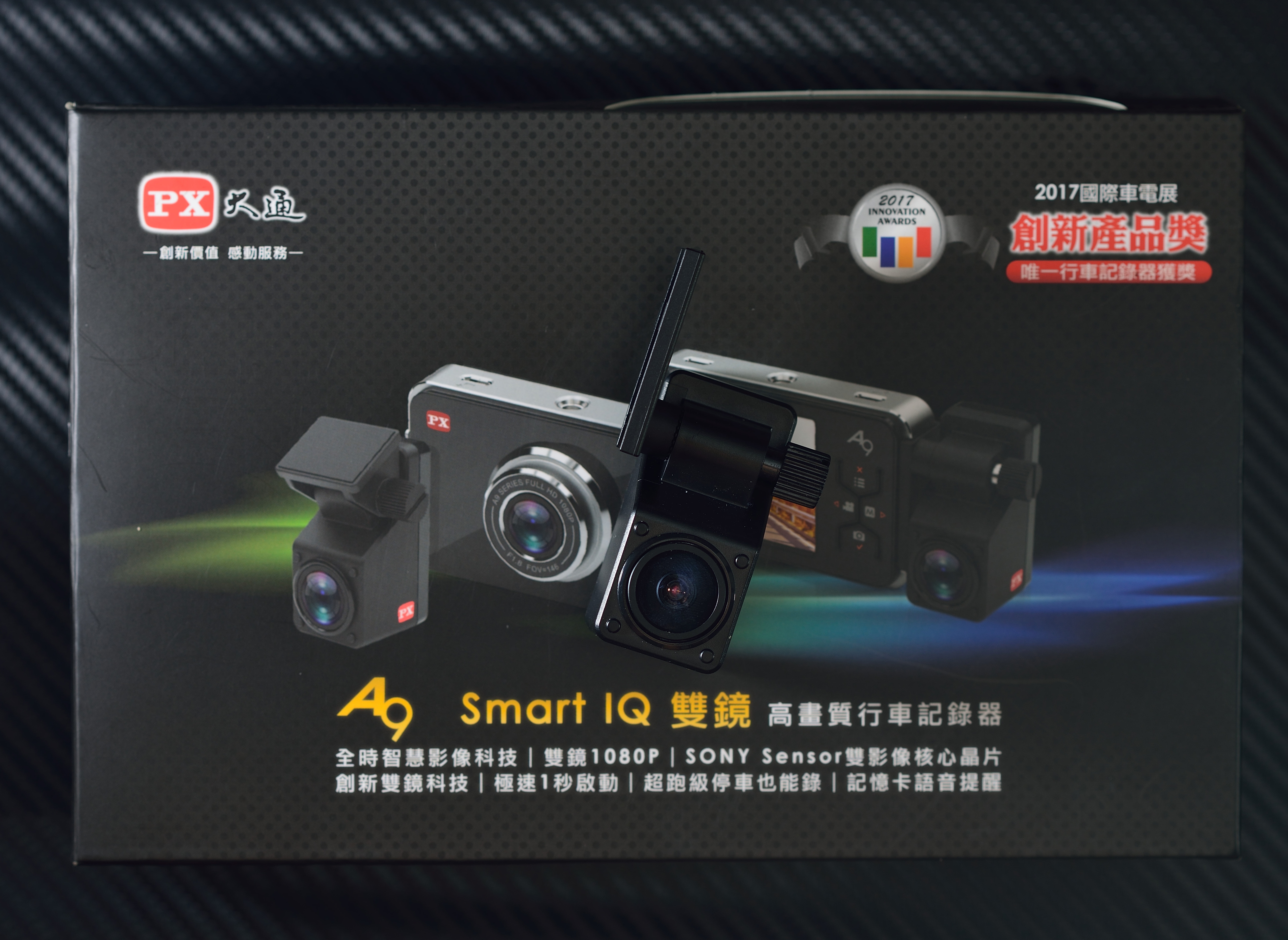 外觀包裝上可看見A9主打的產品優點,右上角還看的到產品穫得2017車電展創新產品展