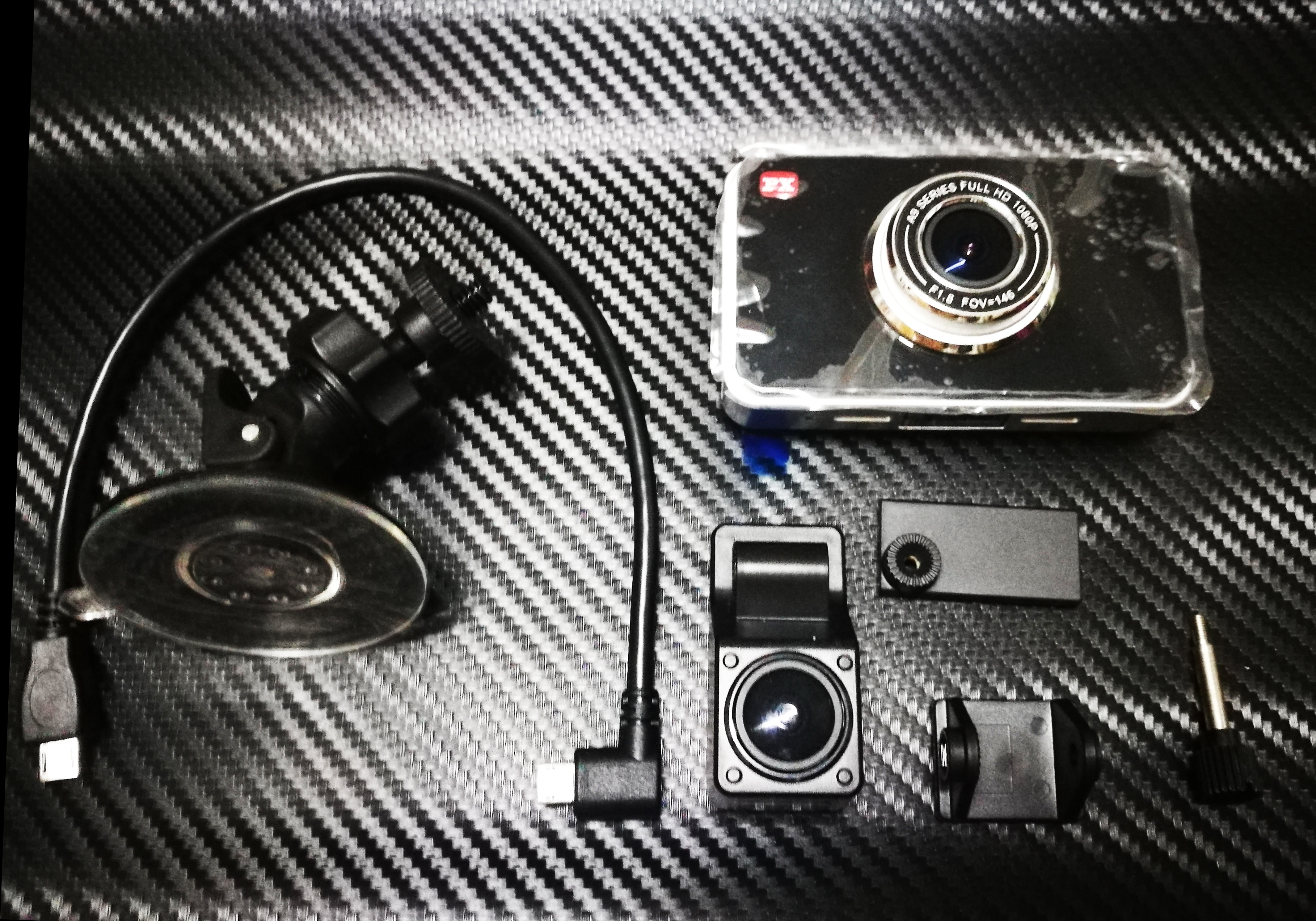 開箱後會看到整體配件有前鏡頭主機、可兩用後鏡頭、與USB線材跟連結吸盤、簡易說明書,以上除了基本配件外,USB線材長度配有三條不同長度,各為0.08M、0.3M、5M長度,短線可用與前鏡頭連接,長線則方便讓後鏡頭延伸安裝於車內後方或左右空間。