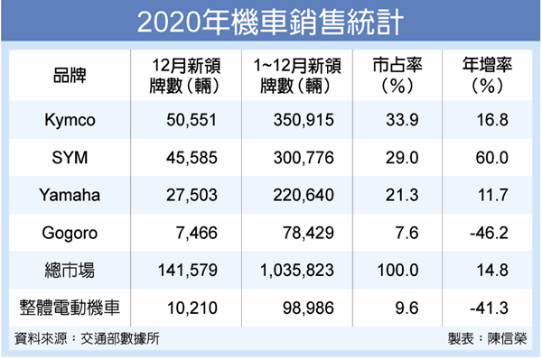 雖然受到武漢疫情的影響,卻因為國內防疫得宜,與國際相比民眾仍能維持九成的正常生活,加上降低使用大眾運輸工具的機率,與2020年的油價走跌等因素,使得速民交通工具的機車在2020年銷售暢旺,並隨著補助減少售價上漲的衝擊,從第三季開始幾乎每個月銷售屢創新高,12月更交出14.1萬輛的成績,當然像KYMCO、SYM等為了供應海外市場需求,幾乎是產線全開拚產量;同時1月份向來是汽機車的淡季,不少廠商會將12月的單壓到1月交車,因此本月的5.2萬輛應該有不少是去年12月的單。至於電動機車方面,龍頭GOGORO只剩下1,067輛,佔有率跌到只剩下2.0%,雖然政府仍維持補助,不過地方政府的補助尚未公布(目前僅有桃園市),故新年度第一個月的銷售量還無法成定局,不過以2020年同期的2,101輛來推估,今年度電動機車的銷售量恐怕也是凶多吉少。