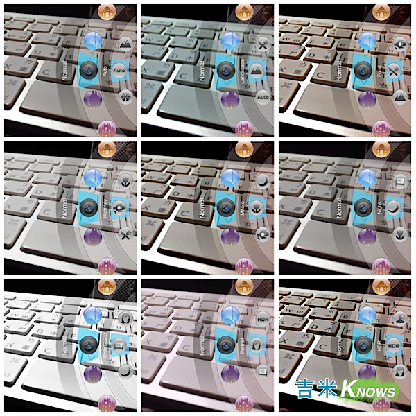 當我們畫面向左滑動時,可呼叫出濾鏡與場景的選單鈕,共有14種濾鏡,並可搭配14種不同的場景,營造出不一樣的照片效果,上圖只展示了其中的九種濾鏡。 |