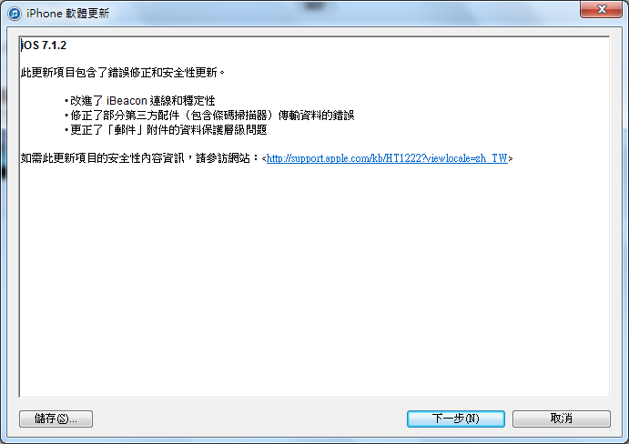 7.直接點「回復iPhone..」, 再按「下一步」, iTunes會自動去官方抓下載最新iOS7韌體並進行安裝。