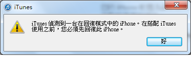 5.出現「...偵測到一台在回覆模式中的iPhone,在搭配iTunes使用之前,您必須先回復此iPhone」, 點「好」。