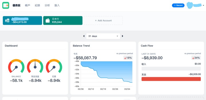 我是用這個(雖然好像很冷門)因為android和ios兩個系統我都有用兩邊都免費((很重要而且同步也蠻快速的在桌機的網頁版也可以看到你所有的資料不過要先註冊帳號facebook和google可以快速註冊雖然他有premium版不過我覺得免費版就很夠我用了上面是iosandroid版本的金額點下去會有馬賽克馬掉你所有的數字(雖然有點意義不明)桌機版本的畫面雖然中英混雜可是點右上角的+Record也可以記帳!!!!還支援其他國家貨幣圖表分析應該就有達到版主想要的年度收支淨額