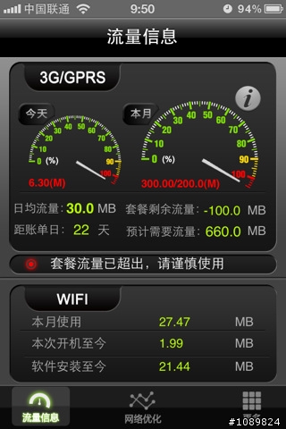 √羅盤圖型展示今天和本月已用流量百分比,清晰直觀。 流量剩餘不足或使用超標出現紅色預警,方便控制流量使用。 3G/GPRS網絡與WIFI網絡分開顯示,日均流量、套餐剩餘流量、距賬單日、預計需要流量一目了然。
