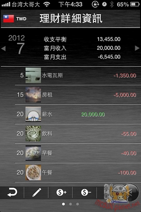 照片輸入,讓使用者可以為這筆支出或收入,加上照片,讓記帳這件事,更加的有趣,同時也可以把敗家成果,記錄上去。嘿嘿。其中還有一個貼心的功能,就是幫你敗家的成果照片分享到臉書上去。這這這,也太方便了。