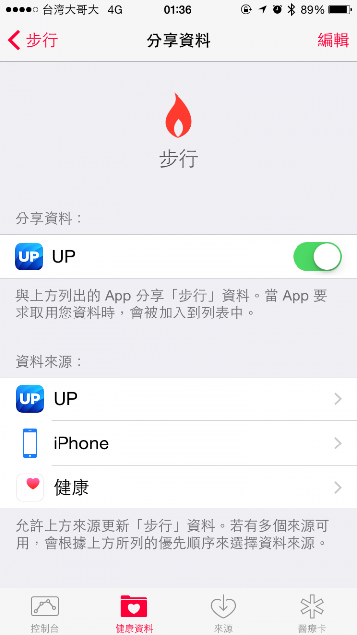 對,我的狀況跟你一樣。 我是用 Runtastic Pro 5.4.4版/iOS 8.0.25.4.4版就是說可以從 Health 讀個人資料,可以寫活動資料到 Health.看來只作到前項,重要的功能沒作到。DeNiro wrote:我也是用這個程式,結...(恕刪)