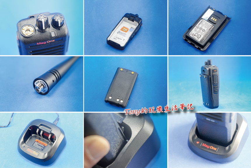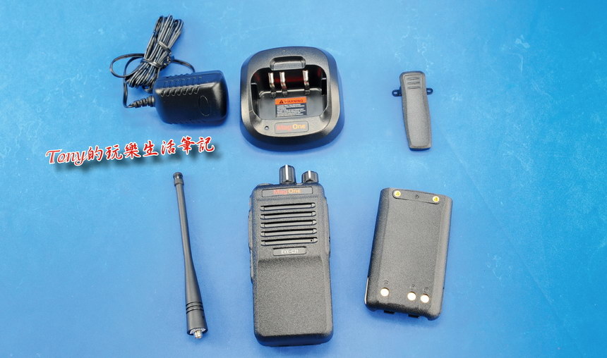 ▲【MOTOROLA MAG ONE EVX-C31 數位可攜式對講機】的主機與配件並不多,除了主機外,就是一個鋰電池還有一隻高頻專用天線(也可以另外購買高db增益天線),另外還有一個背夾(建議一定要裝好),還有就是充電座與變壓器。
