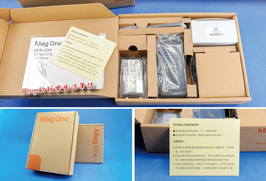 我跟無線電的結緣時間很早,最早是在國中時代就開始買套件去組裝,雖然是只有0.1W的功率,通話只有50公尺左右的距離,但就這樣開始了我玩無線電的歷史。後來還跑到光華商場找香港的無線電雜誌來閱讀學習,也才瞭解,在無線電的世界中,MOTOROLA是最頂級的,軍用的拐拐(軍中對講機的講法),就是MOTOROLA的,那時還跟朋友在中華商場買了三台回來拆修。後來到了無線電話機工廠工作,接觸了長距離無線電話(專賣中東國家,通話距離都在10公里至20公里),還因為後來轉型,也成了國內第一家做無線電對講機的工廠。從Standard C-150玩起,到Kenwood車機,個人在最多時就一次擁有八隻手扒機(手持型的匿稱)跟兩部車載機,還有兩部CB機。過去玩的太兇,曾有一度全都拋售出去。直到後來又因為常跟家人朋友開數部車出門,還有工作上會使用到(工地工程使用),才又買入了幾部手持機。不過因為都是VHF頻段,加上後來持有使用必需去考使用執照,只好轉向去尋找免執照的FRS(FRS是Family Radio Service的縮寫,直譯過來就是民用無線電服務)。如果沒有打算去報考執照的話,就選購免執照的FRS就好,而這次要介紹的這款【MOTOROLA MAG ONE EVX-C31 數位可攜式對講機】就是屬於FRS的一款合法對講機。但是如果想要以後去考個無線電使用執照的話,也可以先去將【MOTOROLA MAG ONE EVX-C31 數位可攜式對講機】做電台登記,之後考照就可以去用燒頻線將功率打開,使用距離就可以更遠了。