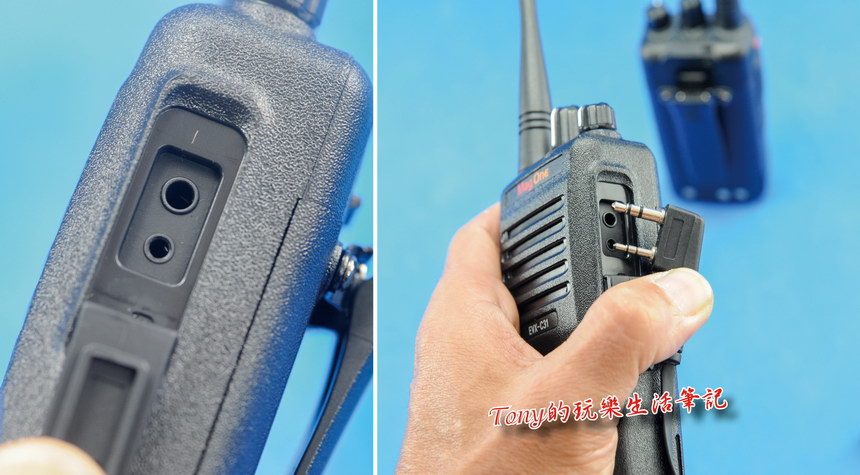▲這是外掛手持麥克風的插座,要提醒一下的是,【MOTOROLA MAG ONE EVX-C31 數位可攜式對講機】所使用的外掛手持麥克風是專用的,耳機與麥克風的插頭間距較小,跟外面所賣的常見手持麥克風看起來很像,但是兩者之間是沒辦法共用的。