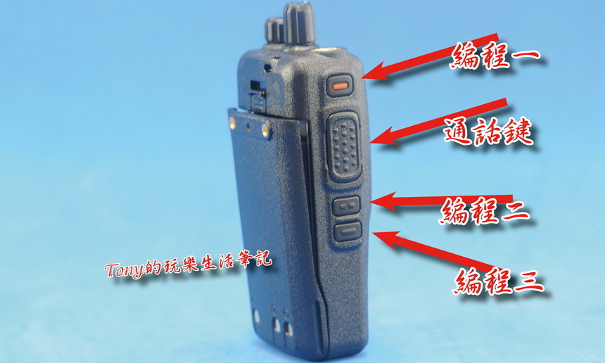 ▲【MOTOROLA MAG ONE EVX-C31 數位可攜式對講機】除了通話鍵外,另外還有三個可以自訂編訂功能的按鍵(原廠有多種功能可以自訂,但需購買燒頻線或請原廠購買時選定功能),這跟大陸做的FRS有些不同(大陸做的就一個SQL靜噪功能跟弱到不行的燈光控制,還不能改功能)。這算是這台【MOTOROLA MAG ONE EVX-C31 數位可攜式對講機】最超值的地方。我手中拿到的,頻道1至9僅有通訊功能,另外三個功能鍵是無作用,而在10到12頻道僅有編程一的按鍵有單獨人員告警功能(僅對同頻道人員發出),而13頻道除了有編程一的按鍵有單獨人員告警功能,還加了編程三的單獨人員告警(此功能為A機按下後,需在60秒內回覆B機,不然B機會發出告警音。但這個功能我用來用去,就是不知道要用在哪個場合)。而第14頻道又更多了編程二的全頻道掃瞄,會自動的輪流掃描所有的頻道,當任一頻道有人發話時,又剛好掃描到該頻道,就能對該頻道通話,但若沒有在5秒內發話,就會再自動的掃描頻道,這個功能對於需要對於各組進行通話的總指揮組來說是很好的功能(多組人員各自有單一頻道使用,而指揮組就能聽到各組的通話)。