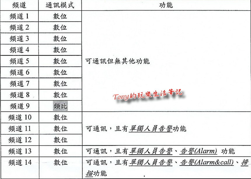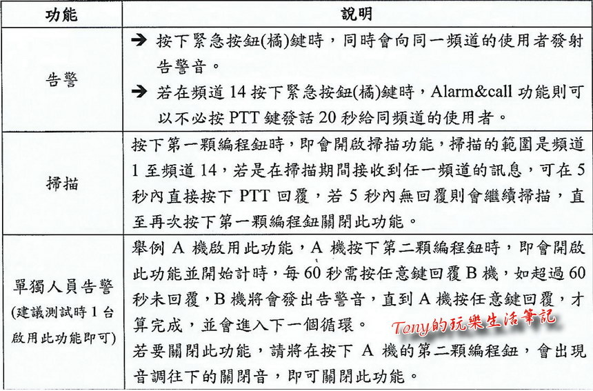 不過就我看說明書來說,看不出來是否所有的頻道都可以設定到三個按鍵(說明書沒寫,但看似可以。另長按與短按時也以設定不同的功能)。而所有功能計有【一鍵通1】、【一鍵通2】、【一鍵通3】、【一鍵通4】、【區域切換】、【中繼/脫網】、【掃描開/關】、【聲控發射開/關】、【電池電量提示】、【高/低功率選擇】、【靜噪級別檢查】、【靜噪級別調整】、【單獨工作開/關】、【報警】、【靜默監聽】、【打開靜噪】等共16種功能可以設定,至於各功能的詳細內容,就請聯絡【群輝商務科技股份有限公司】洽詢更多的詳細內容。