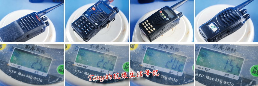 ▲順便比較一下重量,【MOTOROLA MAG ONE EVX-C31 數位可攜式對講機】是裡面最重的,但也只有252克而已,感覺扎實多了。反觀寶鋒BF-888S的154克,超怕會一摔到就解體了。真的不是輕就好,要拿著平衡感夠好,才不會頭重腳輕的感覺會掉了,這點【MOTOROLA MAG ONE EVX-C31 數位可攜式對講機】的配重很不錯,握持感很棒。