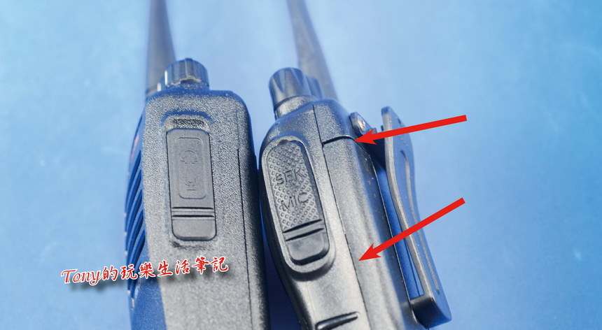 ▲天線是SMA接頭型式,很容易就能找到各種高db增益天線來替換,可以提高收訊的能力,拉長通話的距離。中間的是頻道旋鈕,開機跟轉換頻道時都會有中文的頻道數播報聲提醒。最右邊的是電源開關兼音量大小控制。前面的小白塊是燈號顯示區,發射訊號時是紅燈,收到訊號時是綠燈(但如果有綠燈但沒有聲音,有可能是另外有人也使用了相同頻率,但使用了不同的特定密碼或沒使用指定密碼),如果是橘燈,就是在輪流掃描頻道中(開啟了編程一的按鈕功能)。右邊是背夾的夾扣,使用的是高彈力彈簧,夾扣力不小。