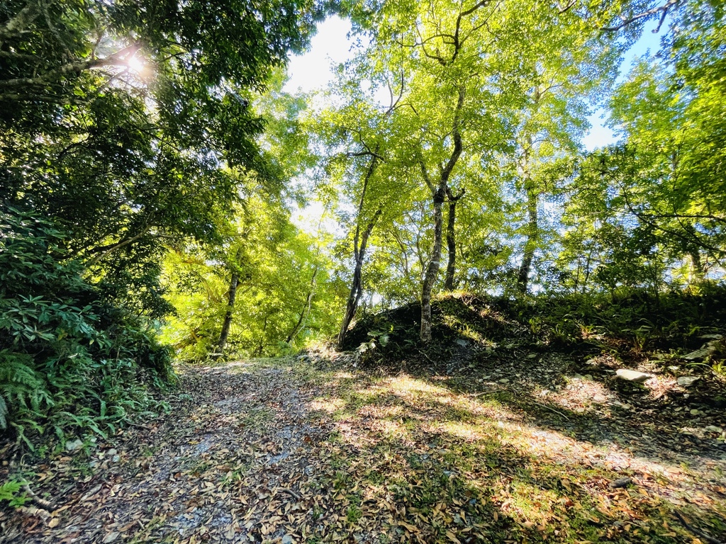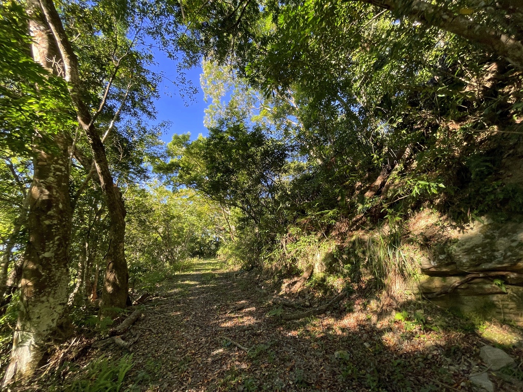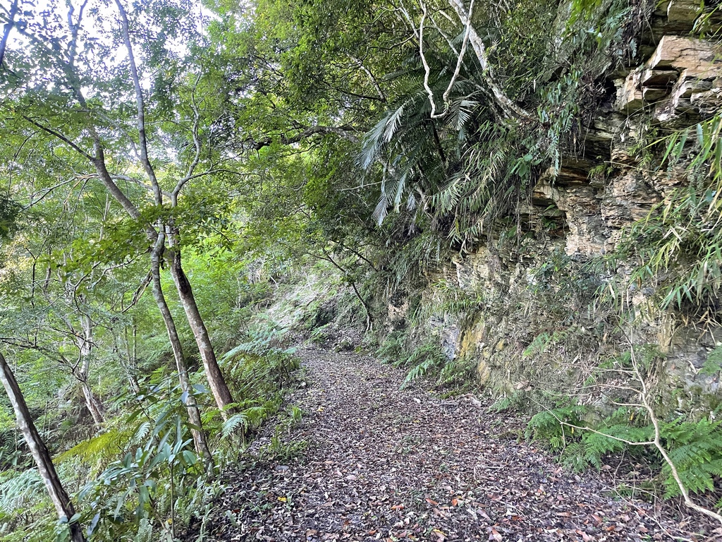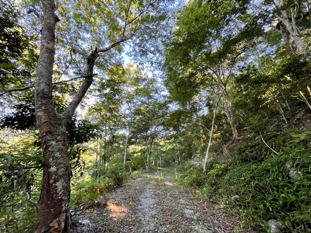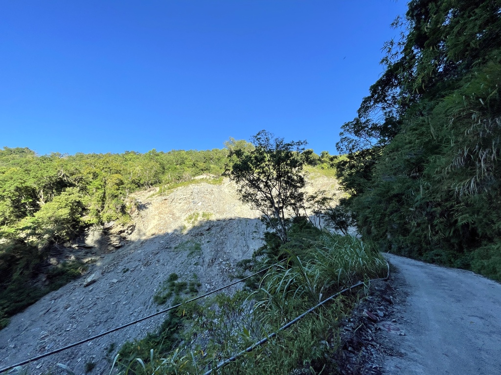 ▲過了崩壁印入眼簾的即是年久未有人煙的林道,樹木和雜草宣告著林道即將被大自然回收。
