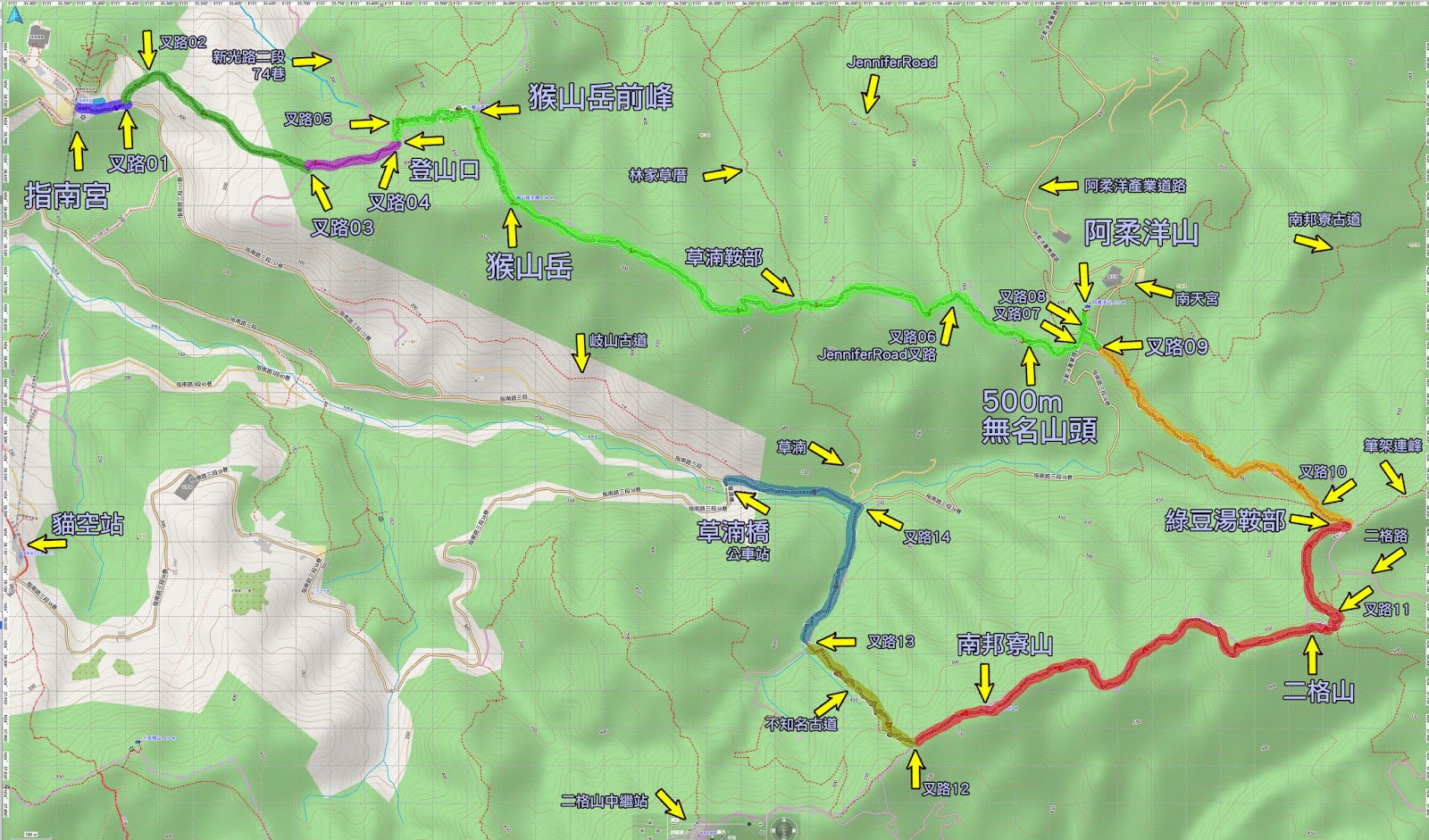 「指南宮」上【猴山岳前峰】、【猴山岳】、草湳鞍部、500m無名山頭、【阿柔洋山】、綠豆湯鞍部、【二格山】、【南邦寮山】、不知名古道、草湳橋。