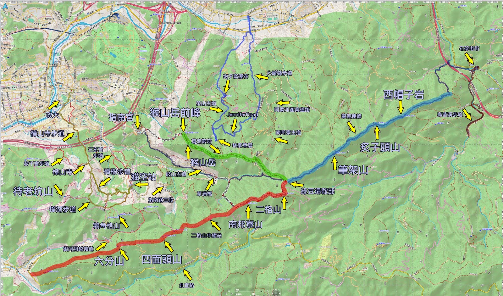 1、〖筆架連峰〗藍色線:【西帽子岩】、【炙子頭山】、【筆架山】(東北石碇老街-西南綠豆湯鞍部)