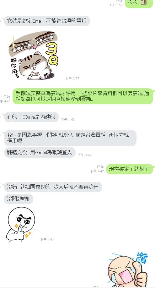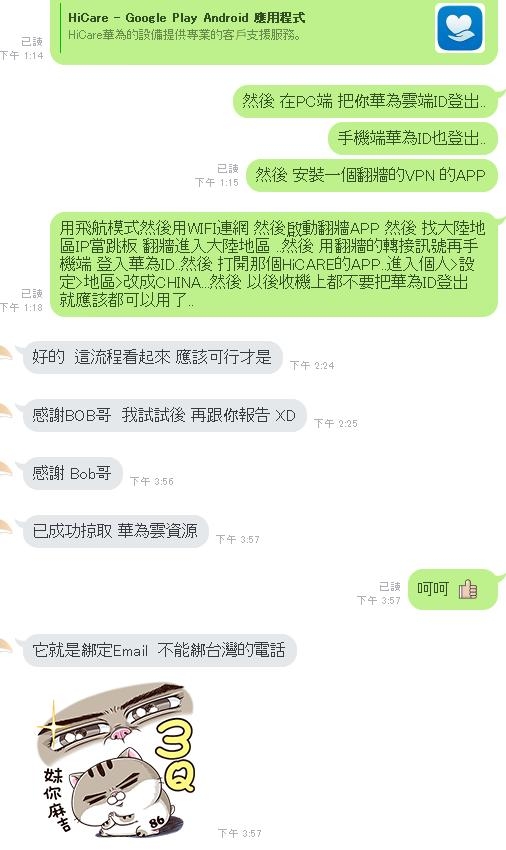 下面對話視窗 是我教一個朋友 台版妹9成功完整使用華為雲端功能的方法..