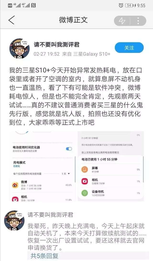 hiklop wrote:造假也信,海軍黑都不...(恕刪) 第一個是華為榮耀,而且當事人都證實了是自己私自去更換電池第二個確實是mate20------還有三星那個什麼用副廠的線充電?要洗也別胡說八道?三星Galaxy S10+手机被曝充电时异常发热并出现了烧焦现象。“自己手机型号是G9750,S10+,黑色128G,使用期间,没有任何的认为损坏,或者是进水之类的。4.2日凌层2点,该用户当时躺在床上关灯闭眼休息了,然后2点快3点的时候闻到了严重的烧焦味,然后发现是源头是正在充电的手机,手机使用的是官方原装充电线。”看到这则消息,我想了想,这是不是其他厂商在故意营销带节奏,于是详细的调查了一下。第一个搜到的是投诉平台上的内容,从时间来看应该就是刚才那一位用户的机子。第三个来源是微博,很搞笑搜到的居然是b站up测评君,本来我还在怀疑是不是有些kol故意黑造的假,而测评君应该是真遇到问题了第四个来源是三星盖乐世社区,问题时间很早,而且社区现在也没删贴,这个问题应该不是造谣,而是问题确实存在所以事情目前来看是:S10确实存在异常发热的现象。而发热的情况经梳理有四种:晚上睡觉手机充电时发热烧焦微信视频发热烫手先行版就算息屏不动也发热耗电一打电话就发热烫手这四种情况归纳起来,存在问题的手机至少有s10+, s10两个型号(分别对应g9750,g9730) ,现象是三星手机在通话及微信视频等非大型运算,充电及非充电,黑屏等等情况都存在异常发热现象。应该不是单纯的快充口问题,也不是处理器的问题,更像是电池有问题。而电池问题,有电池本身和电池仓设计两个可能。一是三星与众不同使用的凝胶电池是否存在发热问题,尤其是s10这次把凝胶电池容量提升到了4100mAH,这个提升非常大,会不会存在问题不得而知。二是三星的电池设计,note7的爆炸原因是由于note7比前代note5电池从3000mAH增加到了3500mAH,而Note7内部空间小,三星为了保证续航,又不想增加厚度,在设计时电池仓结构上砍掉了中壳一排固定螺丝,电池最容易出问题的尾部保护仓不完整,受到冲击以后电池会晃动,尾部受撞击隔膜容易破裂,电池正负极短路引起燃烧或者爆炸,三星会不会为了手机轻薄而又犯了相似的错误。第三就是以上两种问题以外,快充也可能同时存在问题,而快充口的异常发热似乎是祖传的?