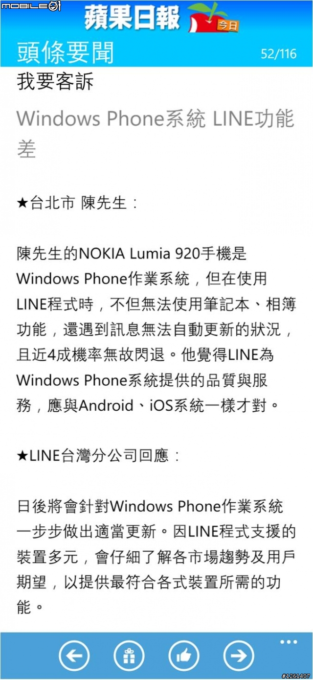 陳先生的NOKIA Lumia 920手機是Windows Phone作業系統,但在使用LINE程式時,不但無法使用筆記本、相簿功能,還遇到訊息無法自動更新的狀況,且近4成機率無故閃退。他覺得LINE為Windows Phone系統提供的品質與服務,應與Android、iOS系統一樣才對。