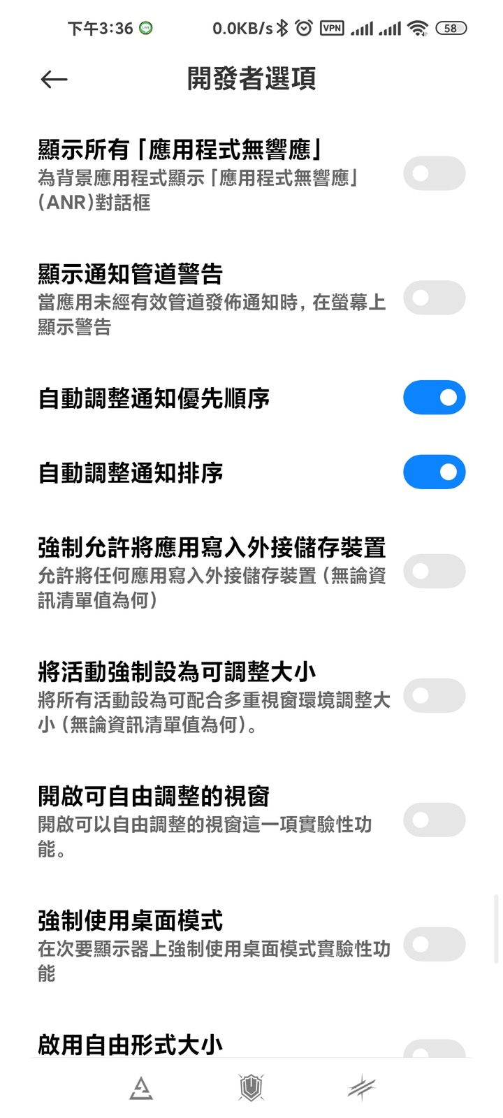 我找到應該是問題來源的設定了,雖然這樣實在很神奇…請進入開發者選項,一路下拉到接近末段處這時應該會發現『自動調整通知優先順序』,這個是勾選的但『自動調整通知排序』卻是沒勾選…於是勾起來吧我勾完就正常了,真是相當好笑的問題點。(當然,前面有人提到的自啟動、省電模式也都還是要設定一下)-順帶一提,我這個是10T刷K30S,MIUI12.5(Android11),而我看了一下另一支12.0(Android10)的小米9T,並沒有『自動調整通知排序』的選項,所以估計是新版的Android與新版的LINE衝突了,這情況在現在台版開始推送12.5的情況下,應該會不斷有人也有相同狀況吧。