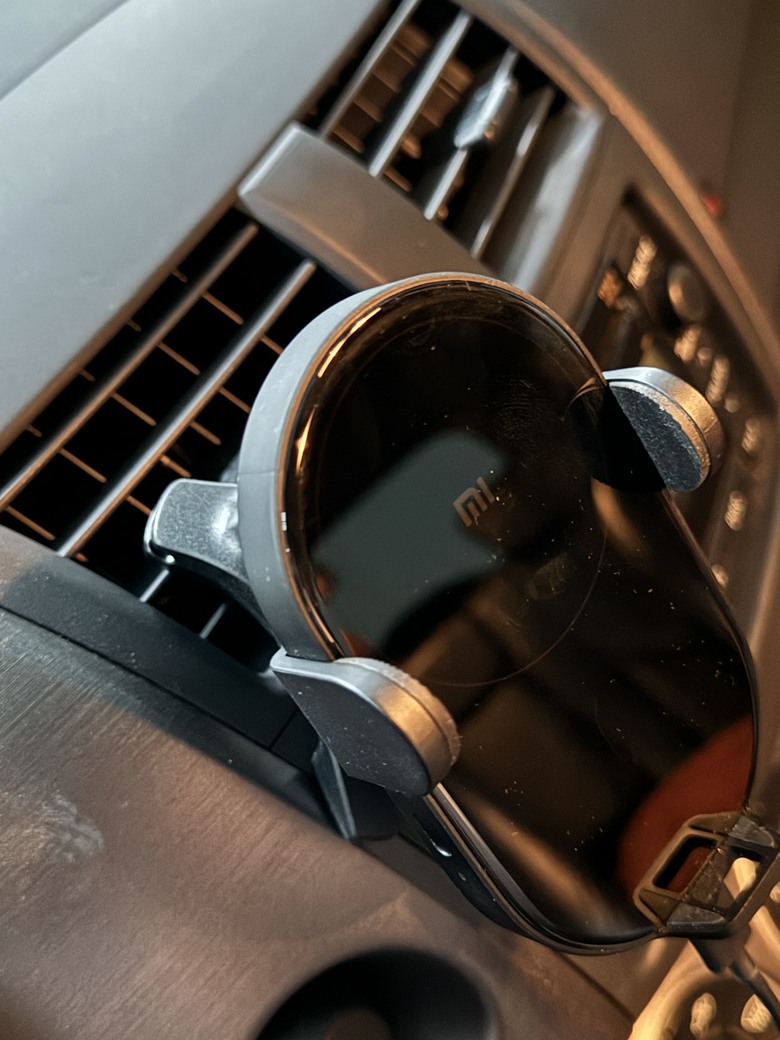 之前也有買夾式的,可是沒多久就夾不住了,後來買Baseus倍思支援QI無線快充的,這個有勾,可以勾到葉片後方,穩定很多,剛好使用米九也支援無線快充,超方便的,不過車子如果出風口葉片是特殊造型就不支援了。